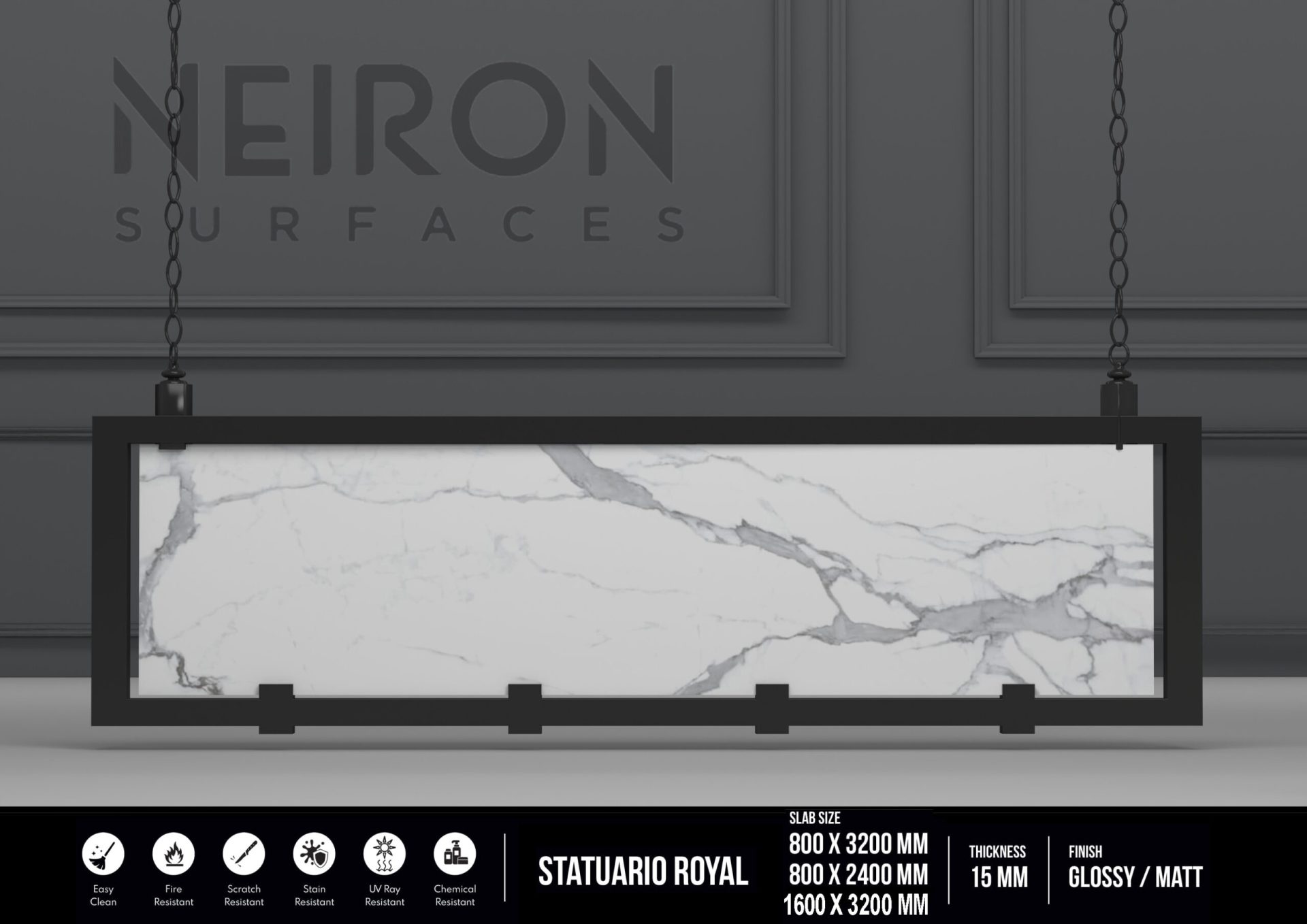 Neiron porselen yüzeyler, mutfaklara modern ve şık bir görünüm kazandırır. Geniş renk ve desen seçenekleri, her tarz mutfak dekorasyonuna uyum sağlar. Hem minimalist hem de daha canlı tasarımlarla mutfaklara estetik bir dokunuş yapabilirsiniz.